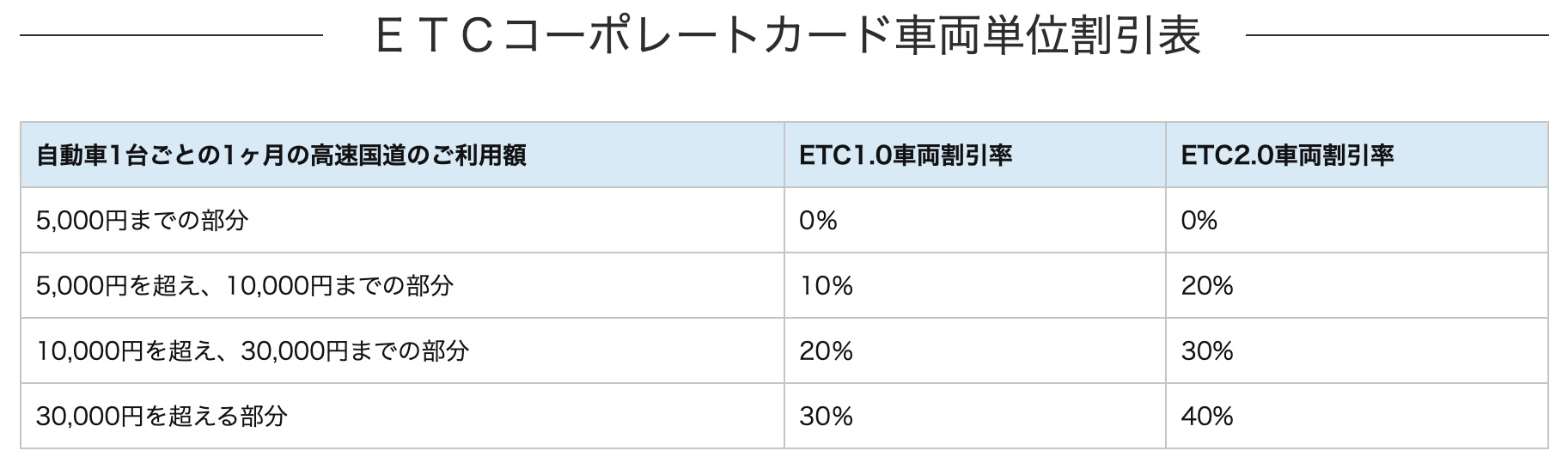 ETC車載器を搭載した登録車両限定で、1ヶ月の高速道路利用額に応じて車両単位で割引が適用されます。特に、車両1台あたり毎月3万円以上ご利用される場合は、大きなコスト削減効果が期待できます。